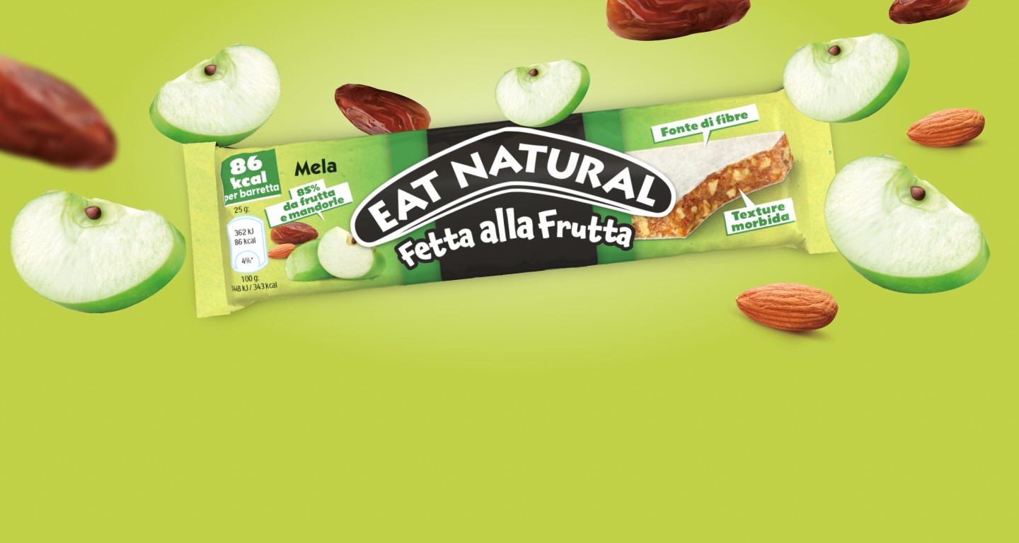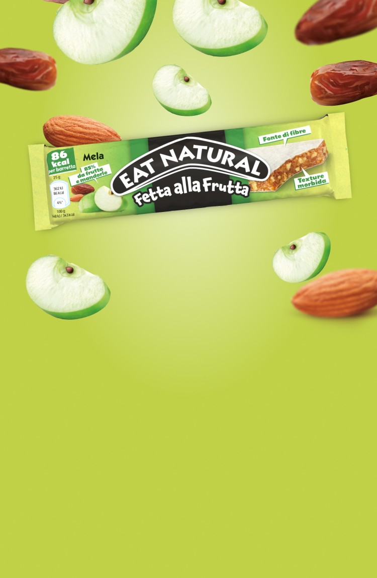 Eat Natural Fetta Alla Frutta Mela contiene l'85% di frutta e mandorle per un gusto naturale e una texture morbida e golosa adatta a tutta la famiglia. Con 86 calorie, senza glutine e fonte di fibre, è uno snack pratico e gustoso.